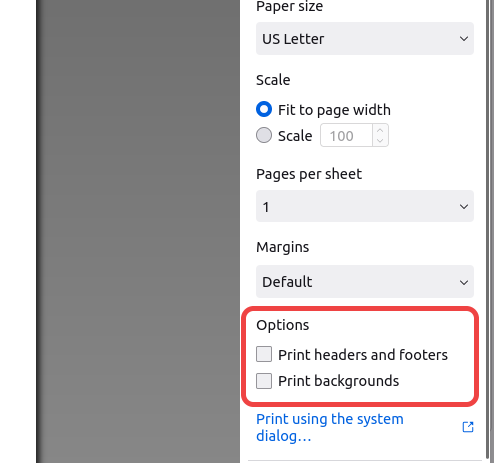 Firefox users may run into this issue. To remove the links and headers: On the print dialog, click "More settings" then uncheck the "Print headers and footers" checkbox.